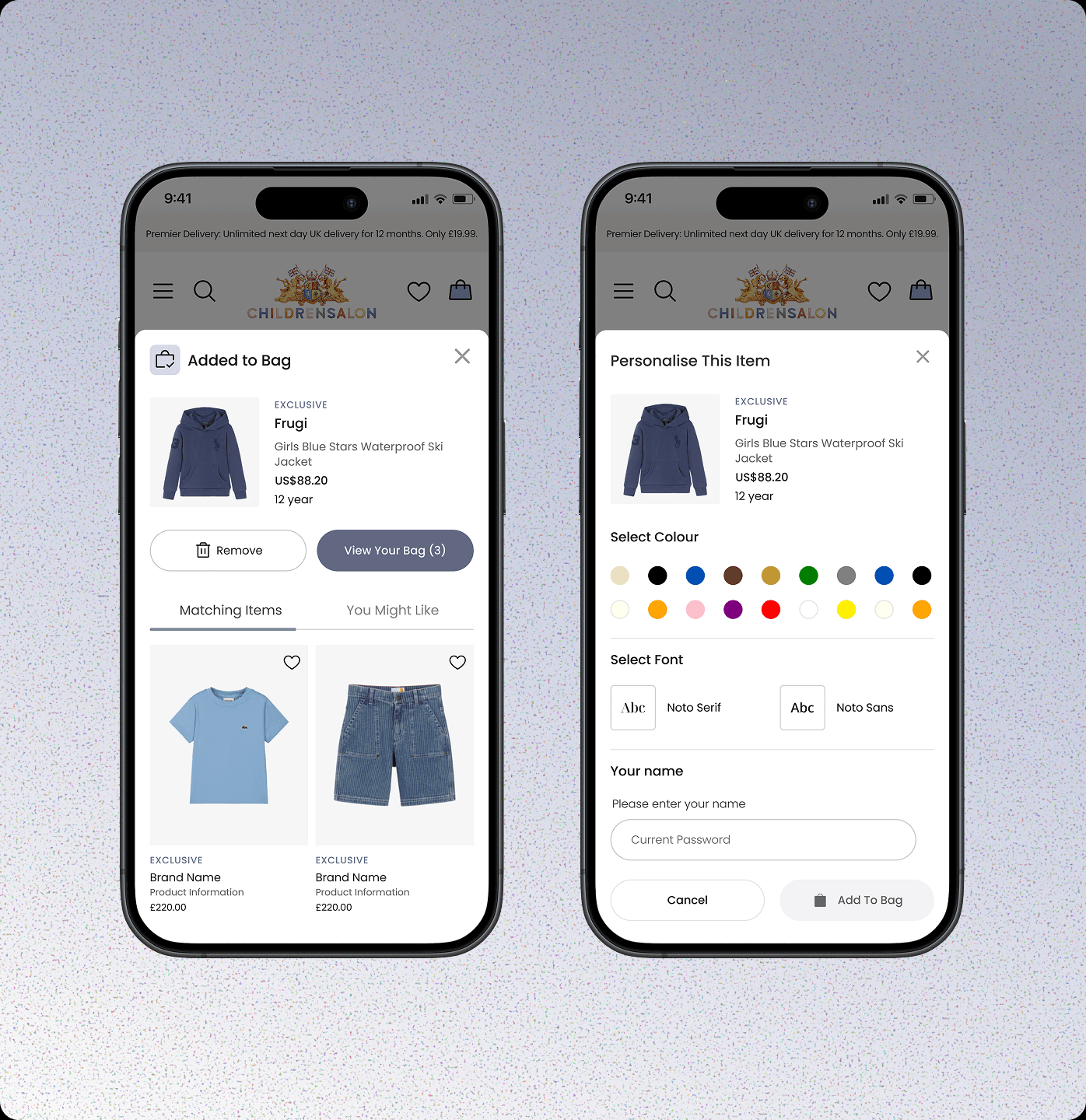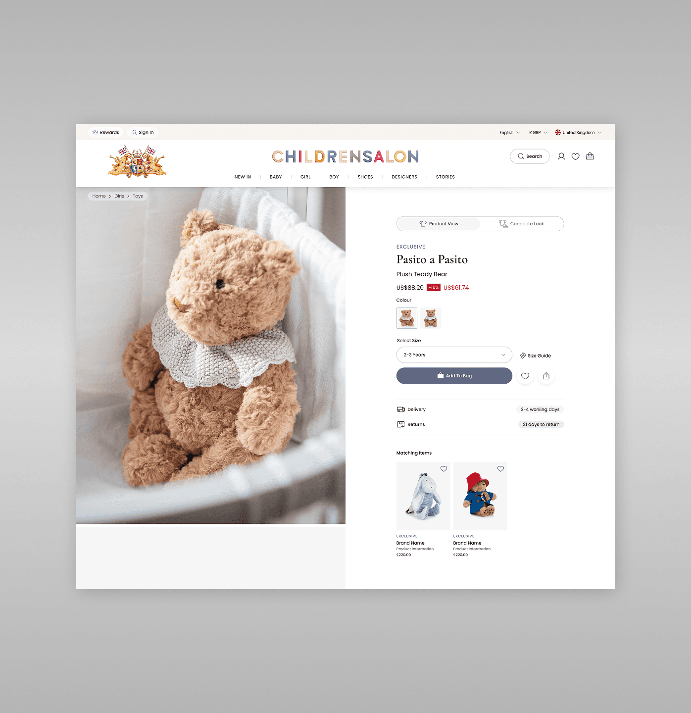 Delivery and returns were brought forward with clear visual cues and I introduced a refined serif typeface for titles and brand names, alongside updated iconography across the page. Product labels, from Sale to Coming Soon to Personalised, were rethought to feel more consistent and intentional.